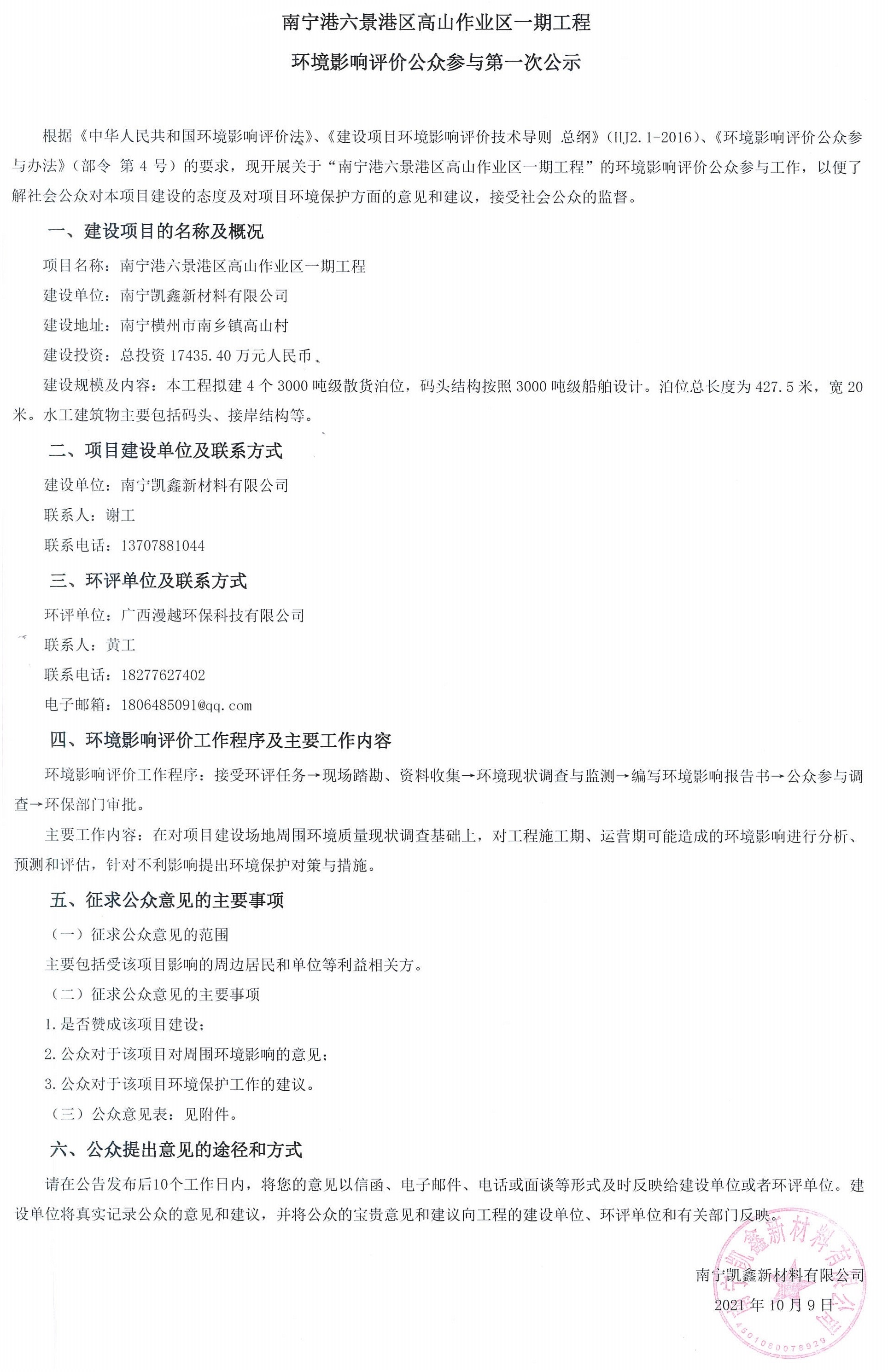 南寧港六景港區(qū)高山作業(yè)區(qū)一期工程環(huán)境影響評(píng)價(jià)公眾參與第一次公示