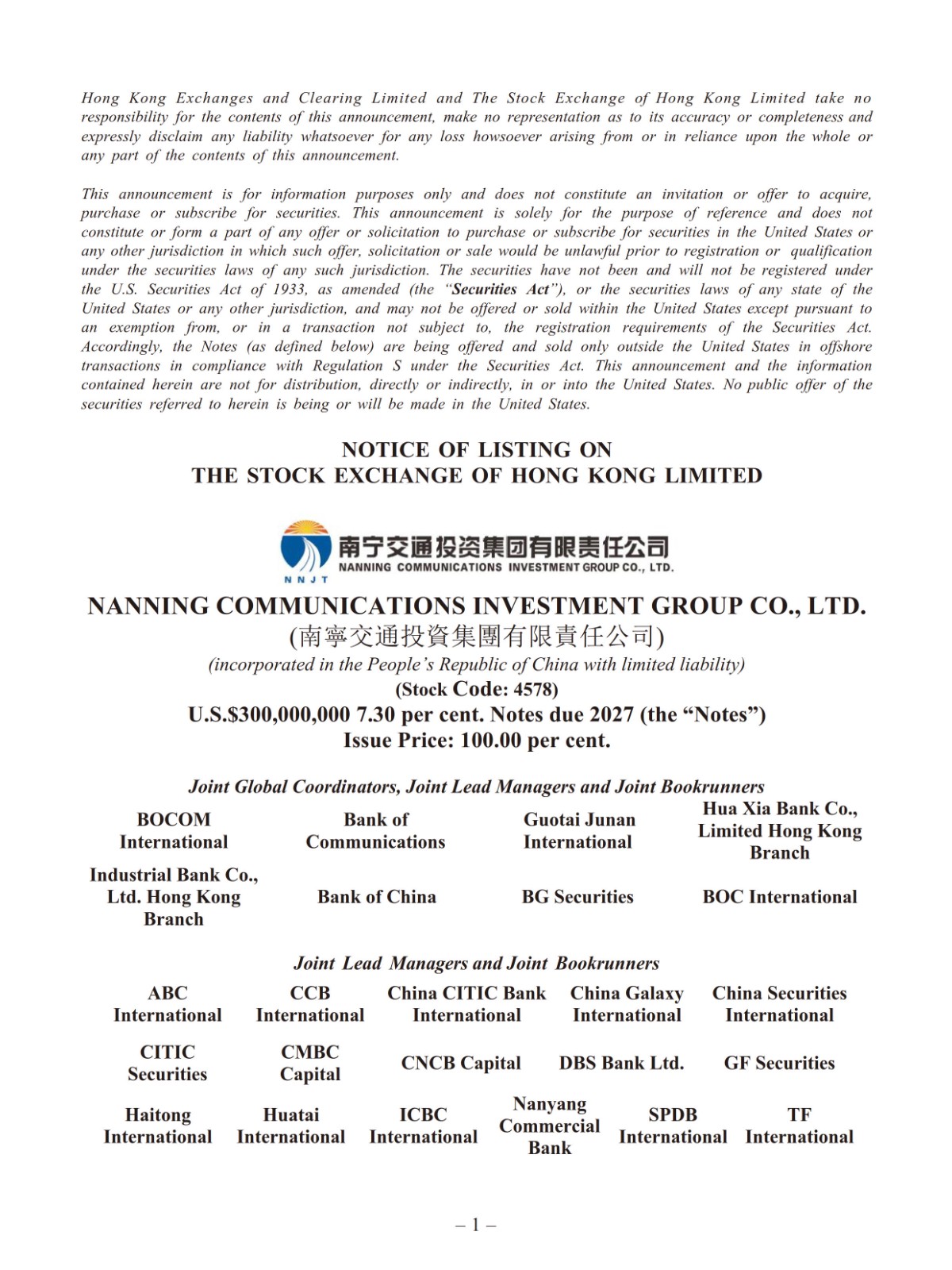 Publication of the Offering Circular - Nanning Communications Investment Group Co., Ltd.(南寧交通投資集團有限責(zé)任公司) - U.S.$300,000,000?7.30?per cent. Notes due 2027