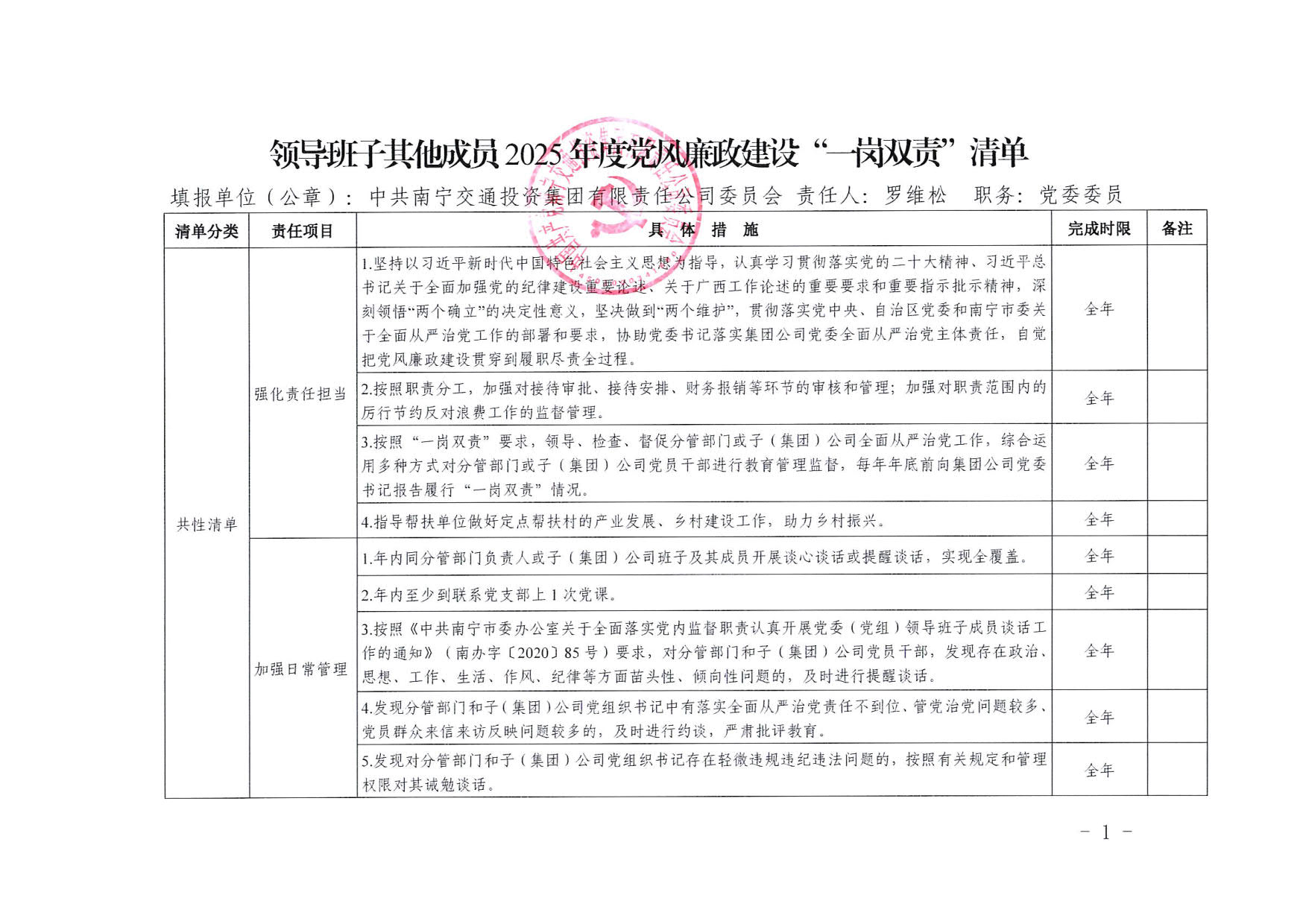 南寧交投集團(tuán)領(lǐng)導(dǎo)班子其他成員2025年度黨風(fēng)廉政建設(shè)“一崗雙責(zé)”清單(四)